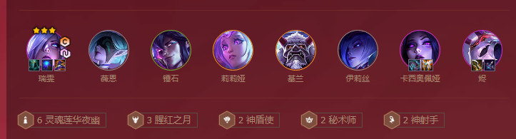 1、阵容组成:该阵容主要由一下英雄组成,因为阵容输出高,缺乏前排所以该阵容克制玉剑男刀以及忍刺阿卡丽。比较怕三国瑟提以及大成重秘阿狸。瑞文能到三则换瑞文主C,不能的话装备就一直给VN,让VN主C。