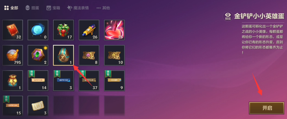 金铲铲之战的宠物蛋(小小英雄蛋)需要玩家在战利品界面中打开,具体操作如下图所示。在金铲铲之战中玩家获得所有战利品都在这里,例如表情、道具、时空魔盒、小小英雄蛋以及聊天气泡和双倍经验卡等。
