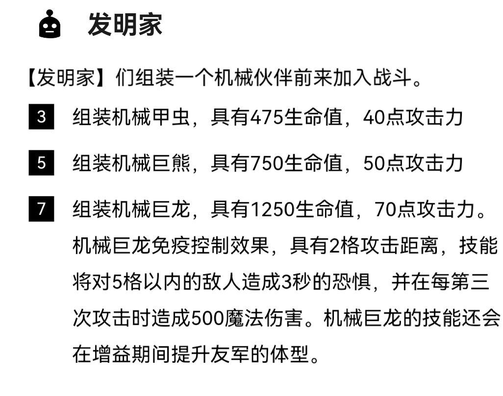 1、首先金铲铲之战发明家羁绊的效果使召唤机械伙伴。3、5、7发明家都是不同的机械伙伴。