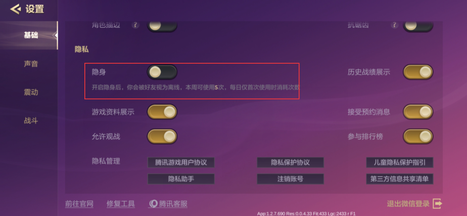 进入游戏设置,点击基础,下拉一段在隐私设置中即可看到隐身选项,选择后好友看你的状态就是离线了,每周只能使用五次,每天消耗一次次数。