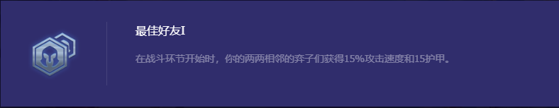 1、最佳好友强化符文的效果是在棋盘上两两相邻站位的英雄可以获得15%的攻速加成和15的护甲加成。所以触发它的关键就是两两相邻的站位要求。