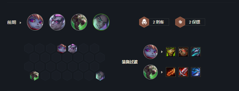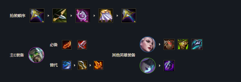 4、早期过渡:前期最好连胜过度,保镖加刺客,格斗加刺客,海克斯也可以。只要可以带德莱文装备的英雄都可以拿来打工,打工体系要立体!