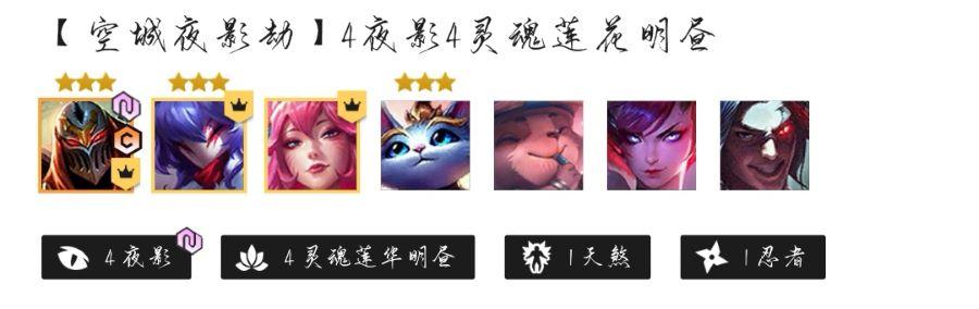 1、金铲铲之战中明昼劫阵容由:劫、千珏、狐狸、猫咪、提莫、伊芙琳、凯隐组成,阵容羁绊为:4夜影、4灵魂莲华明昼、1天煞、1忍者。