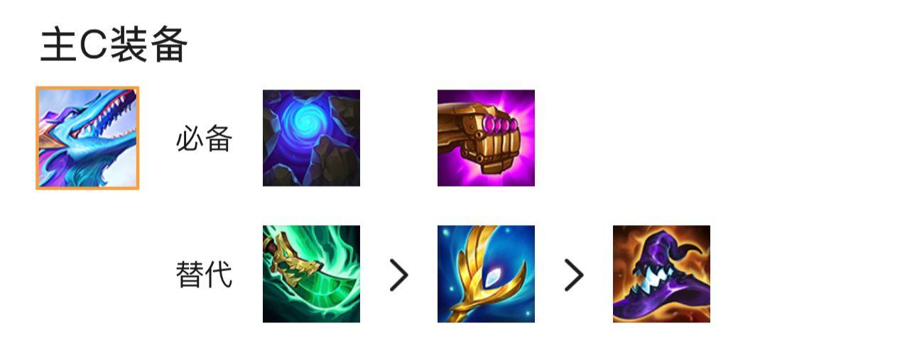 3、主C索姆的必备装备是蓝霸符、珠光护手,替代装备是朔极之矛、大天使之杖、班克斯的魔法帽,如下图所示。