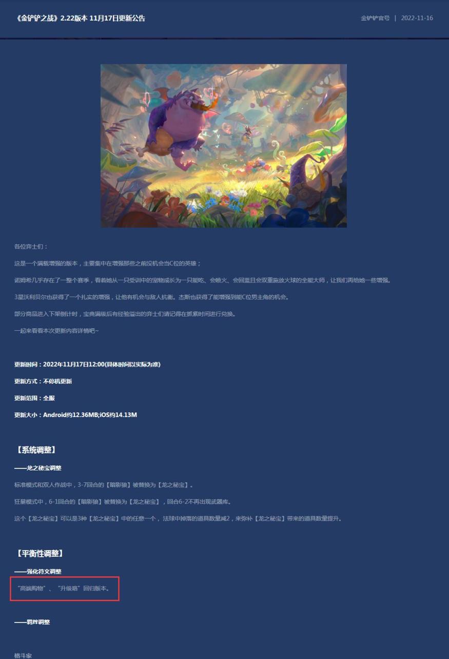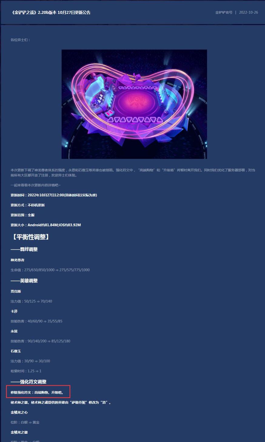 金铲铲之战移除升级咯强化符文是在2022年10月27日更新的2.20b版本,与升级咯一起被移除的强化符文还有高端购物。