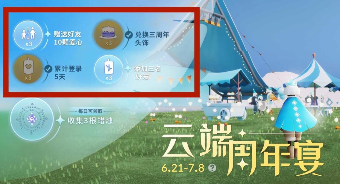3、点击进入云端周年宴之后,即可看到周年庆的四个任务了,完成即可领取相应奖励,还有每日收集三根蜡烛可以随机领取的奖励。