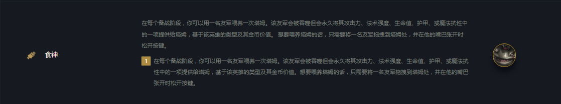 在金铲铲之战中,塔姆的食神羁绊可以进食队友从而增加自己的基础属性。塔姆在吃队友的时候需要将该奕子移动到塔姆身上,等待塔姆嘴巴张开时松开手指即可。
