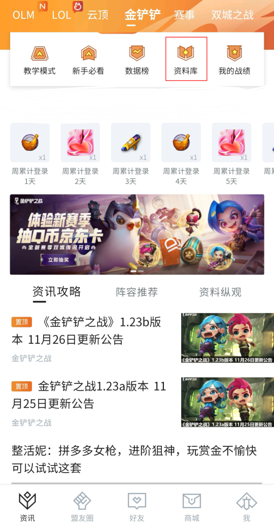 1、打开掌上英雄联盟,进入金铲铲板块,然后点击资料库。