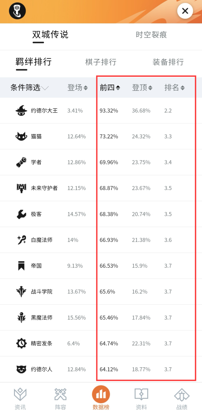 2、进入资料库后,点击下方的数据榜,就可以看见每个阵容的各项数据排行了。