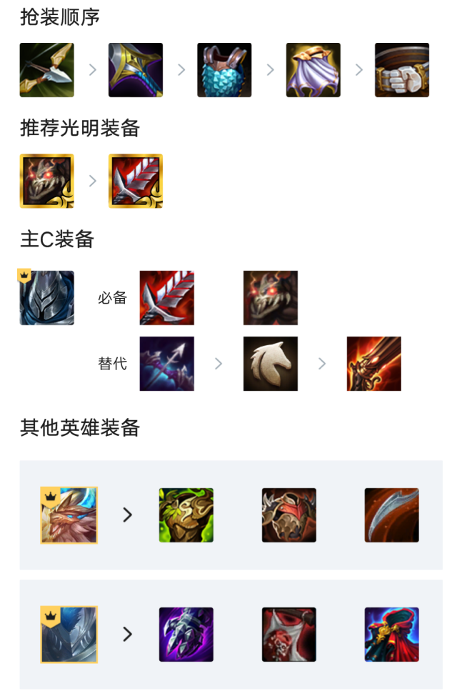 装备方面武器饮血泰坦必备,如果实在没有饮血,正义之手也是可以的。第三件如果专门为了打阿克尚,那重骑转职是最好的,对面太弱可以考虑破甲弓。肉装给加里奥,辅助装给泰坦,法装给盖伦。