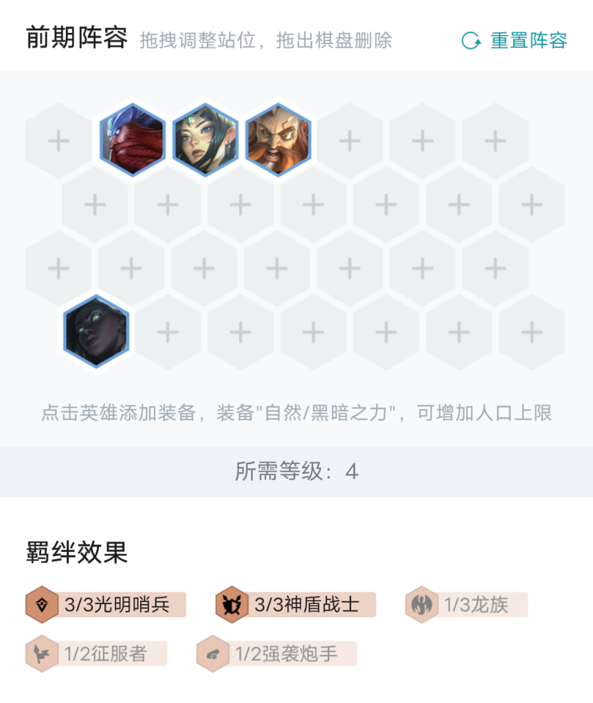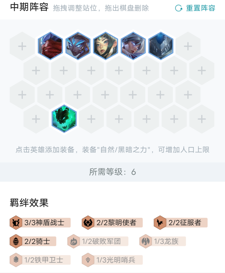 上六人口后如果没有两星奥拉夫,但嫖到一张豹女、瑞文可以选择以豹女为核心的羁绊搭配骑士。如果有两星奥拉夫可以在上面的阵容搭配骑士,把塞纳换成派克。