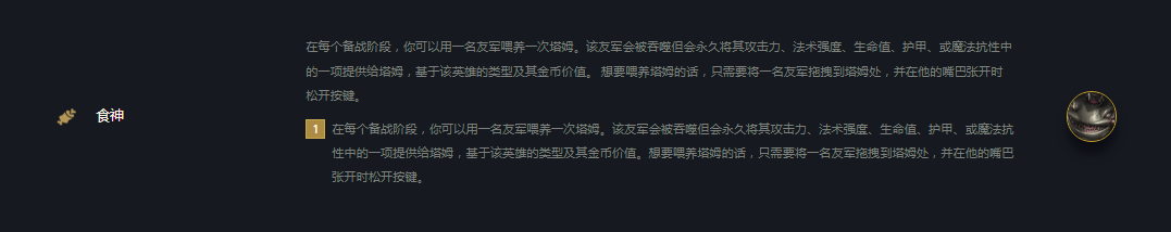 1、塔姆可以利用自己的食神羁绊去吞噬己方奕子,每吞噬一个己方奕子都会增加塔姆的基础属性(每回合仅能吞噬一个己方奕子)。