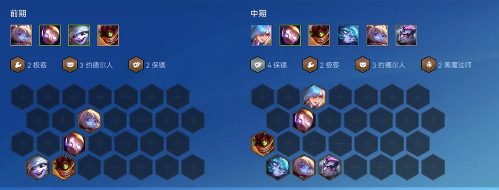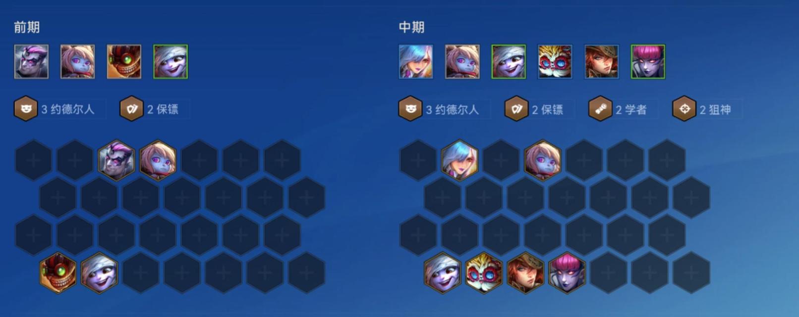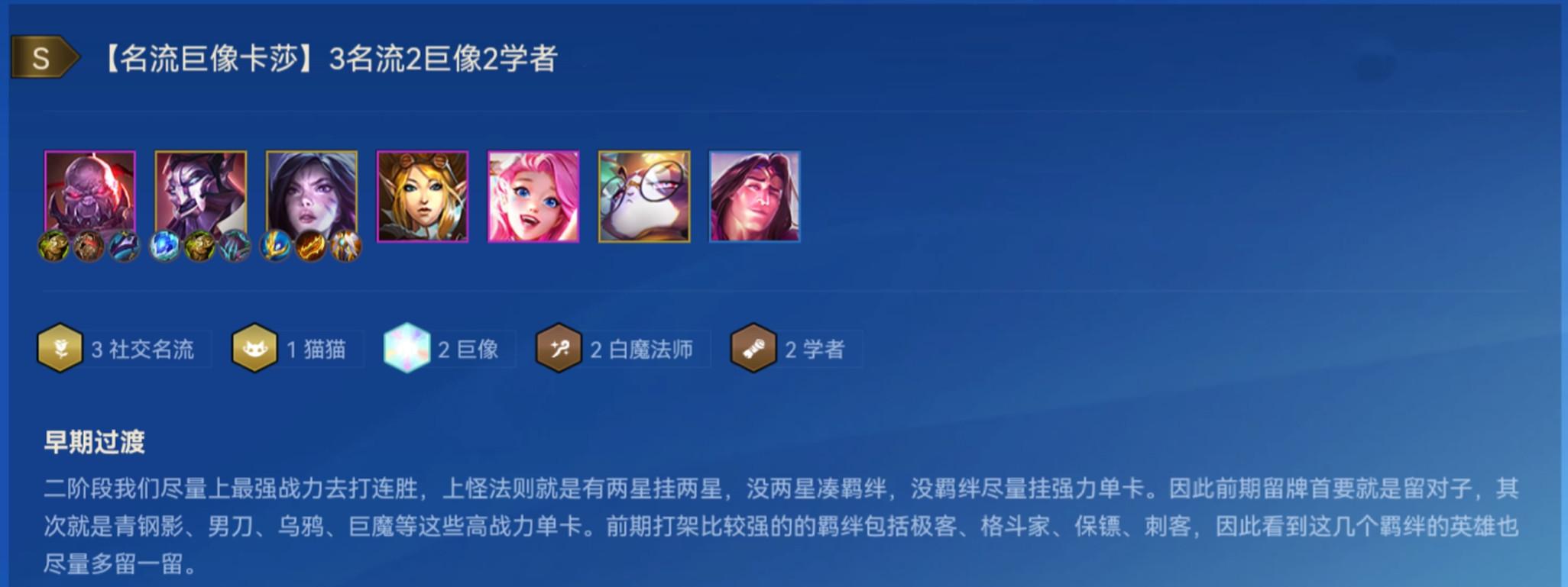 (2)前中期过度:二阶段我们尽量上最强战力去打连胜,上怪法则就是 有两星挂两星,没两星凑羁绊,没羁绊尽量挂强力单卡。因此前期留牌首要就是留对子,其次就是青钢影、男刀、乌鸦、巨魔等这些高战力单卡。前期打架比较强的的羁绊包括极客、格斗家、保镖、刺客,因此看到这几个羁绊的英雄也尽量多留一留。