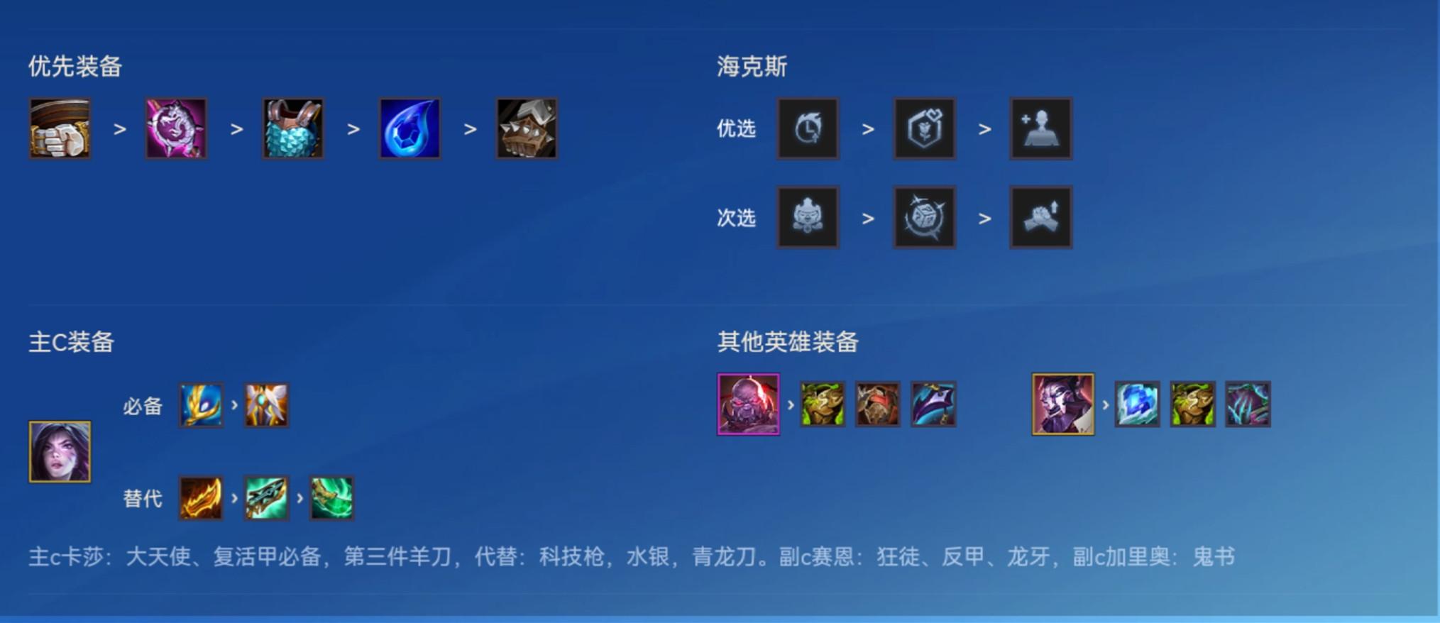 (4)阵容站位:如下图站位即可,需要注意的地方就是如果聚光灯在第一排就给加里奥,其他位置都是卡莎站。