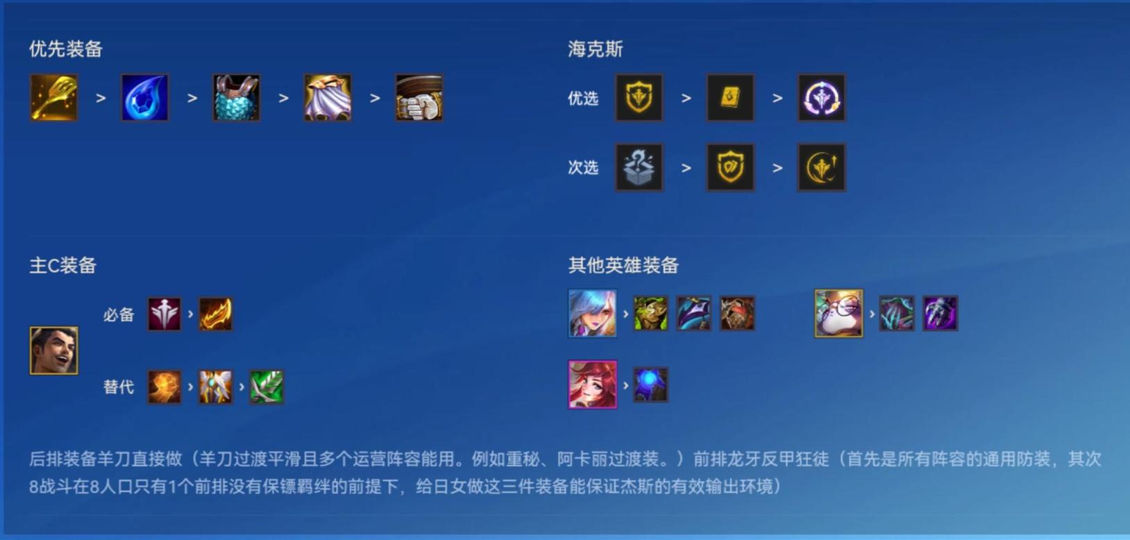 (2)前中期过度:前期有三约用三约。能打连败时尽量连败。保证选秀顺位吃连败考虑第一次选秀的铲子。 拿到这局游戏即拿下一半。在2- 4选秀没有铲子的情况下。根据你的连败血量,来考虑后面是吃5连败还是拉5保血量。86血以上为健康可吃5连败。保证3- 4选秀顺位能优先选择铲子。80血以下为不健康。拉5凑出正常过渡质量。战斗学院底牌留一留。例如男枪盖伦。不卡利息可留单只卡特(不需要合二星)、女坦等。 意在3-3黄金海克斯战斗学院转职书的概率3-4选秀没有铲子。根据所做装备例如羊刀。往重秘或阿卡丽方向走。由于前期的三约连败吃利息。经济会非常合理。只有单个水滴的情况下。大天使不建议直接做。