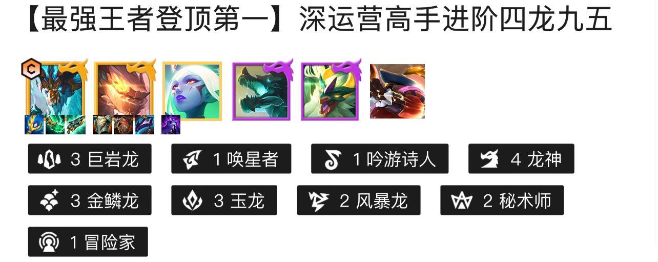 1、在金铲铲之战中,四龙阵容是由3巨岩龙、1唤星者、1吟游诗人、4龙神、3金鳞龙、3玉龙、2风暴龙、2秘术师、1冒险家组成。