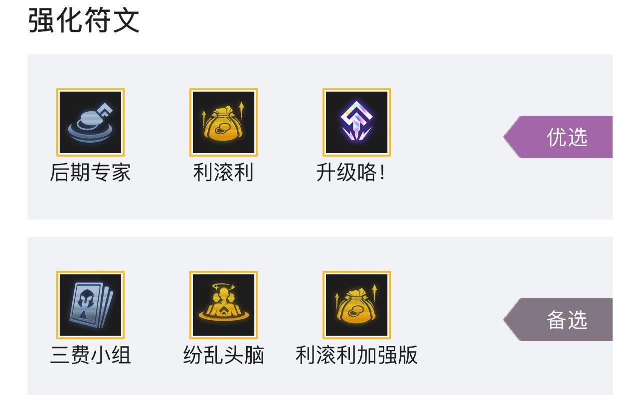 2、强化符文优选后期专家、利滚利、升级咯,备选三费小组、纷乱头脑、利滚利加强版。