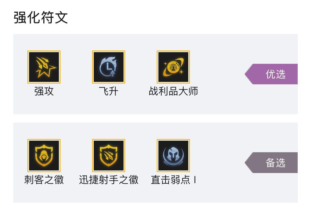 2、强化符文优选强攻、飞升、战利品大师,备选刺客之徽、迅捷射手之徽,直击弱点1。