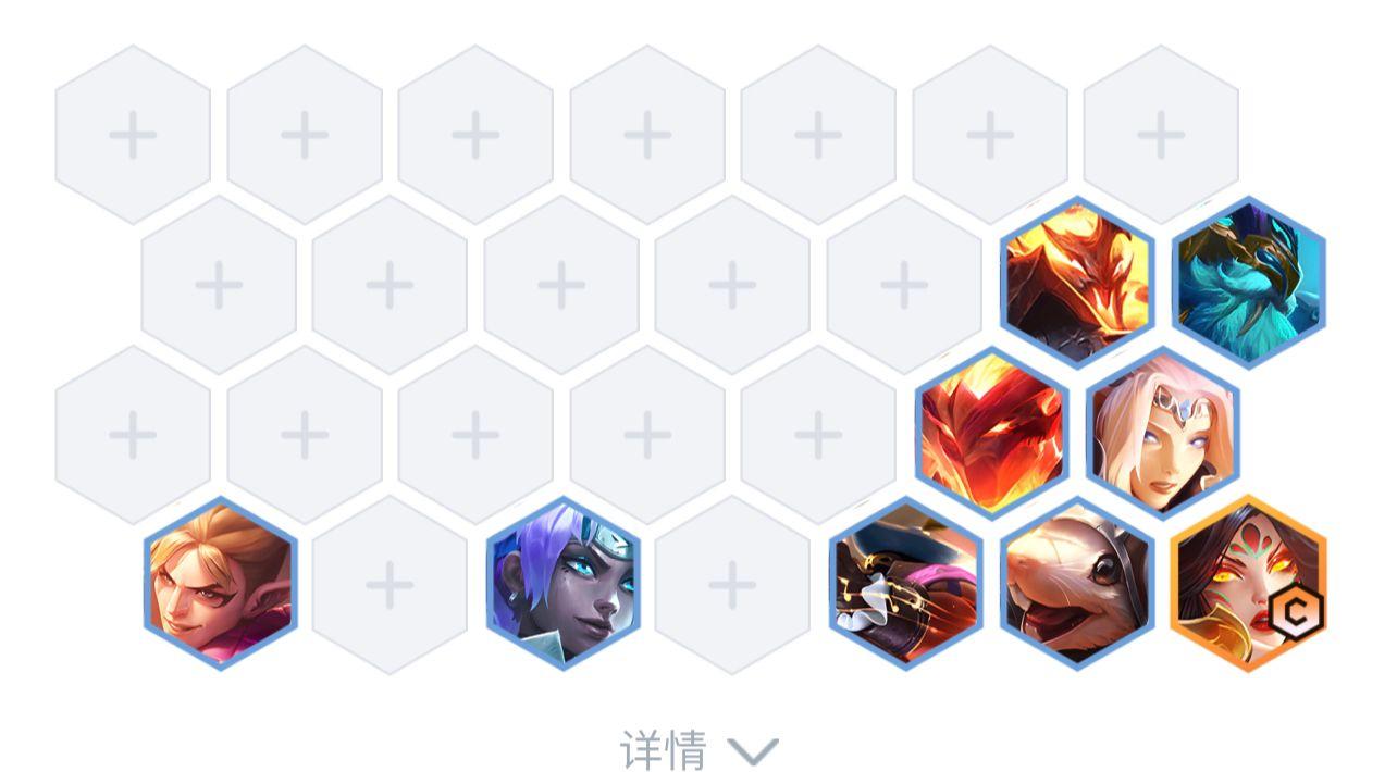 8、后期成型阵容站位如下图所示,赫卡里姆、奥恩在第二排抗伤,慎、瑟庄妮在第三排保护,泰隆、奇亚娜、巴德、图奇、霞在最后一排输出。
