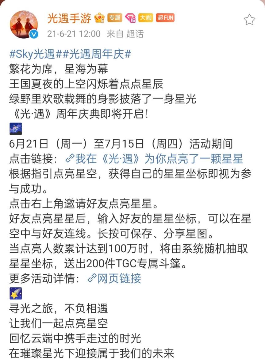 在2021年,光遇国服在6月21日上线了周年庆活动!玩家通过蜡烛兑换到心仪的周年庆物品。而在2022年,预计也会在同一时间上线周年庆活动!因此,光遇三周年活动预计在6月21日左右上线!