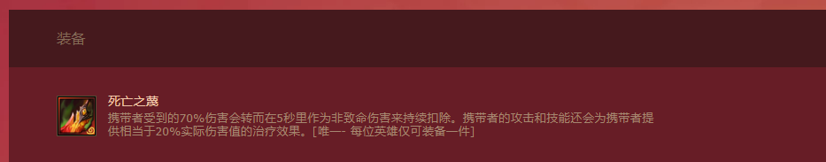 1、死亡之蔑的效果是:携带者受到的70%伤害会转而在5秒里作为非致命伤害来持续扣除。携带者的攻击和技能还会为携带者提供相当于20%实际伤害值的治疗效果。
