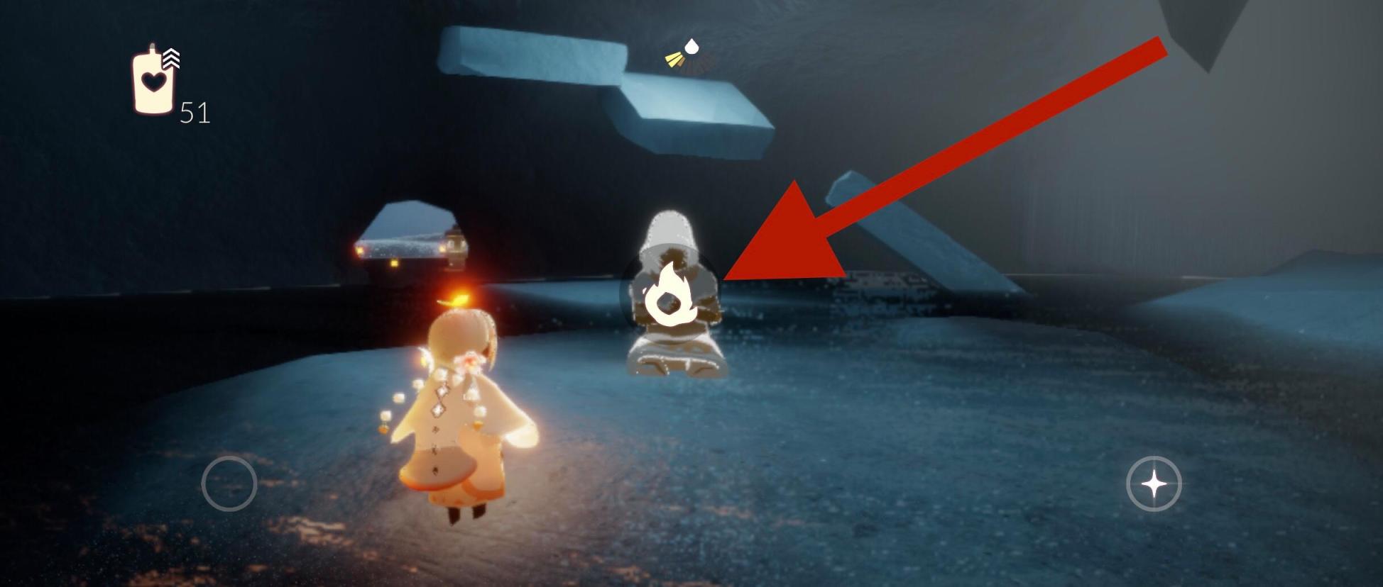 4、进入山洞之后,即可看到捂脸动作先祖,点击先祖身上的火焰,即可收集先祖,收集方式是追随光影。