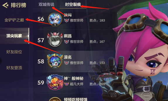 玩家首先打开金铲铲之战的游戏,接着点击左上角的小图标,然后点击排行榜,最后即可查看,排名分为双城之战和时空裂缝,同样这两个模式也分为金铲铲之巅和顶尖玩家两个板块.