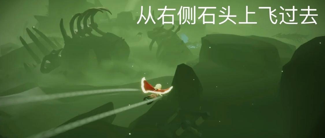 2、接着起飞,向右边顺着右侧的石头上飞过去,飞到上空之后向下看可以看到一个篝火堆。