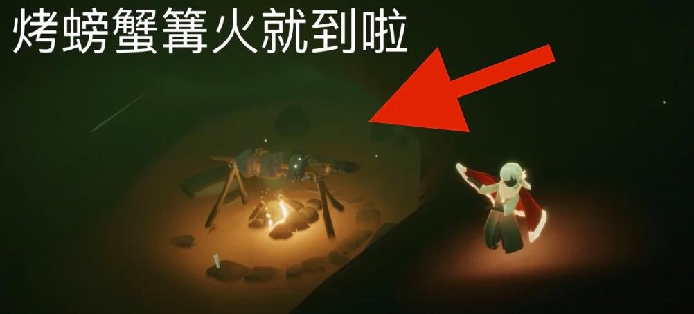 3、朝着篝火堆方向飞下去,到达之后还会看到火堆上烤着螃蟹,这里就是暮土营地了,火堆旁会出现烛火,在这里可以挂机收烛火。