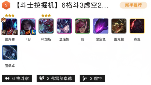 1.阵容推荐:雷克塞,卡莎,大虫子,瑟庄妮,蔚,鳄鱼,赛恩,冰女,组成羁绊为6格斗3虚空2弗雷尔。