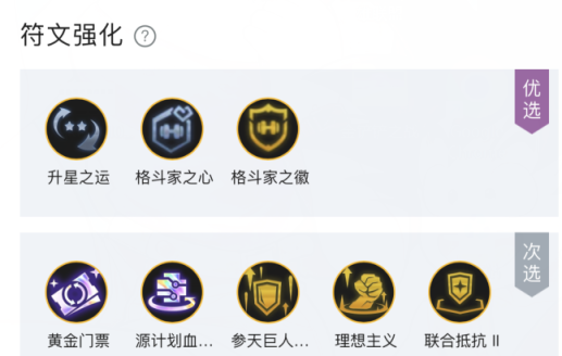 2.强化符文选择:优选升星之运,格斗家之心和格斗家之徽;次选黄金门票,源计划血蛭3,参天巨人的坚决,理想主义,联合抵抗2。