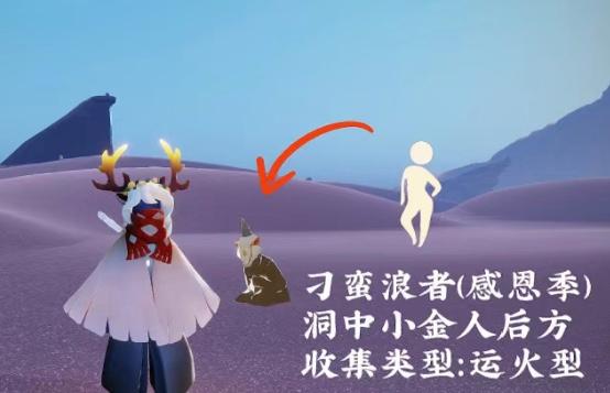 1、感恩季先祖共六位,分别在六个地图中,感恩季的刁蛮浪者先祖,位置在晨岛小金人山洞的后面,动作是单手叉腰站姿,可以跟这位先祖兑换黄鼠狼面具,收集方式是运火。
