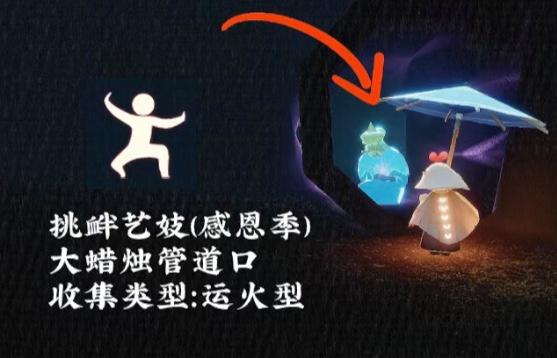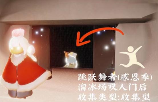 4、感恩季的跳跃舞者先祖,位置在霞谷滑冰场的双人门内,动作是跨栏,可以跟这位先祖兑换红狐狸面具,收集方式是触碰散落的光柱。