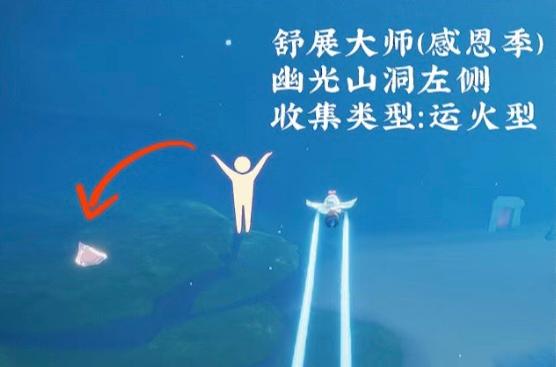 3、感恩季的舒展大师先祖,位置在云野蝴蝶平原左侧隐藏图,动作是双手托举,可以跟这位先祖兑换宋小宝帽子,收集方式是运火。