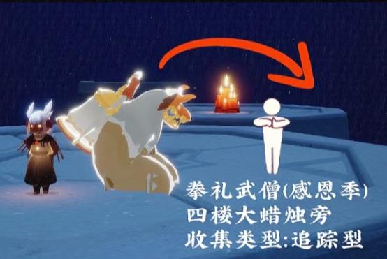 6、感恩季的拳礼武僧先祖,位置在禁阁的四楼,有小金人亭子的右后方,动作是抱拳,可以跟这位先祖兑换牛头面具,收集方式是追踪先祖光影。