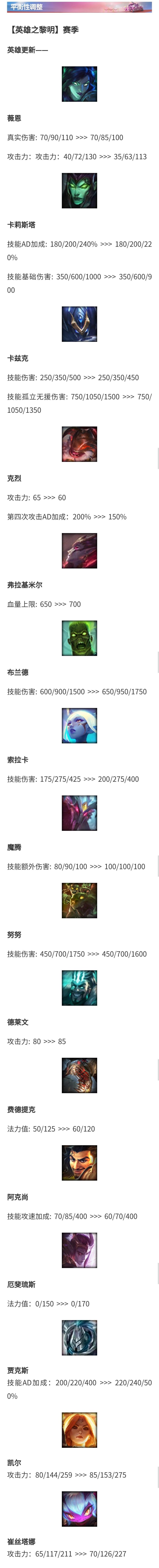 (1)薇恩:真实伤害: 70/90/110 >>> 70/85/100;攻击力:攻击力:40/72/130 >>> 35/63/113。