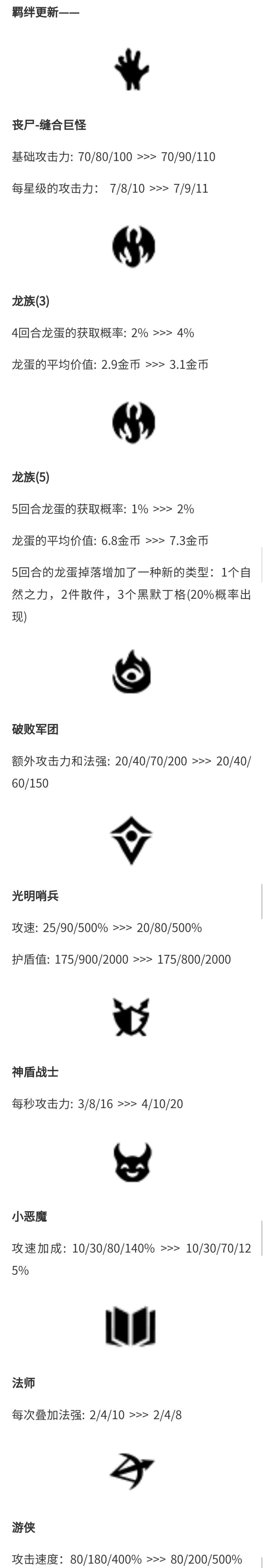 (3)龙族(5):5回合龙蛋的获取概率: 1% >>> 2%;龙蛋的平均价值: 6.8金币 >>> 7.3金币;5回合的龙蛋掉落增加了一种新的类型:1个自然之力,2件散件,3个黑默丁格(20%概率出现)