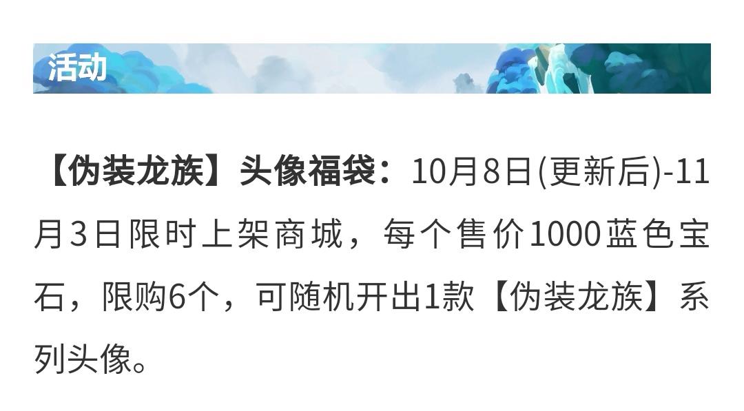 【伪装龙族】头像福袋:10月8日(更新后)-11月3日限时上架商城,每个售价1000蓝色宝石,限购6个,可随机开出1款【伪装龙族】系列头像。