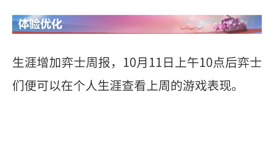 生涯增加弈士周报,10月11日上午10点后弈士们便可以在个人生涯查看上周的游戏表现。