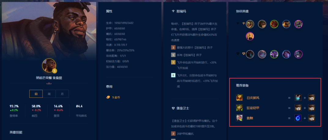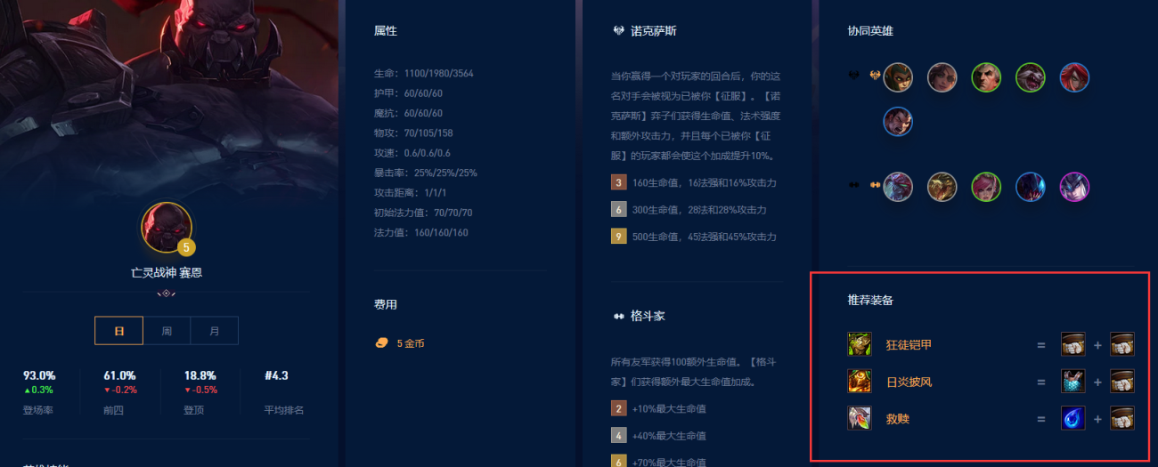 赛恩的推荐装备是狂徒铠甲、日炎披风、救赎。