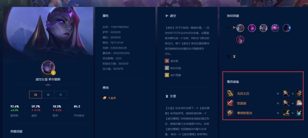 卑尔维斯的推荐装备是无尽之刃、饮血剑、泰坦的坚决。
