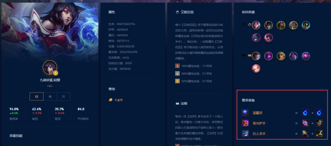 阿狸的推荐装备是蓝霸符、珠光护手、巨人杀手。
