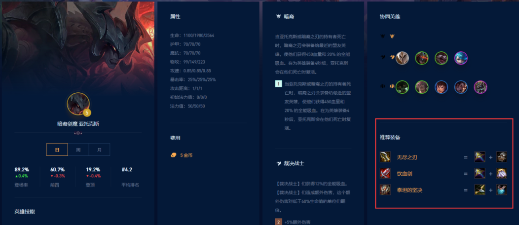 亚托克斯的推荐装备是无尽之刃、饮血剑、泰坦的坚决。