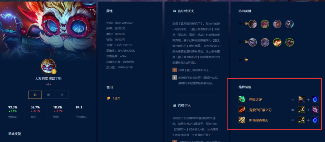 黑默丁格的推荐装备是朔极之矛、鬼索的狂暴之刃、斯塔缇克电刃。