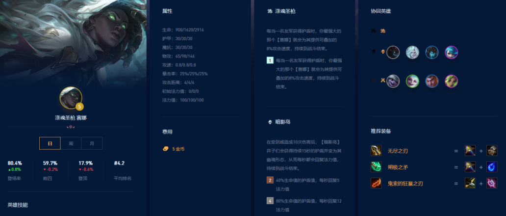 赛娜的推荐装备是无尽之刃、朔极之矛、鬼索的狂暴之刃。