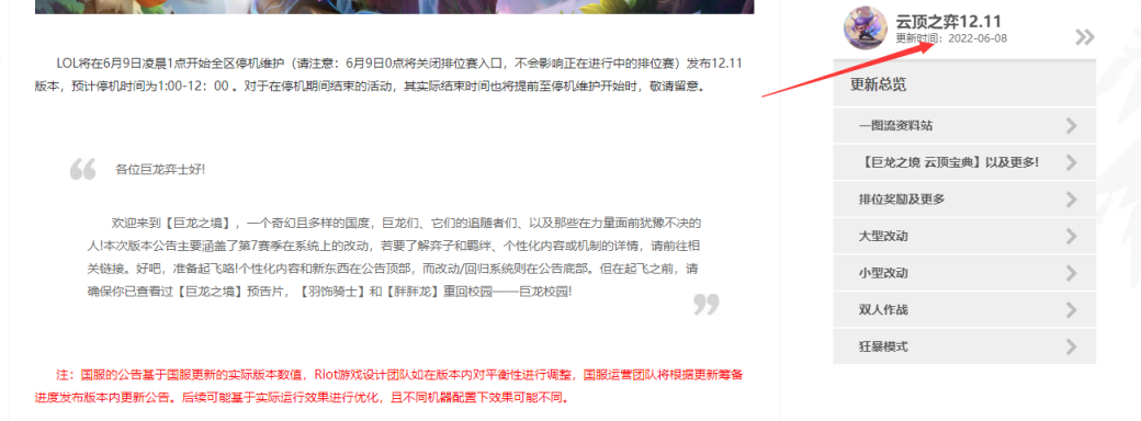 2、而云顶之弈巨龙之境是在2022年6月8日进行的更新,时间上相差了一周多。