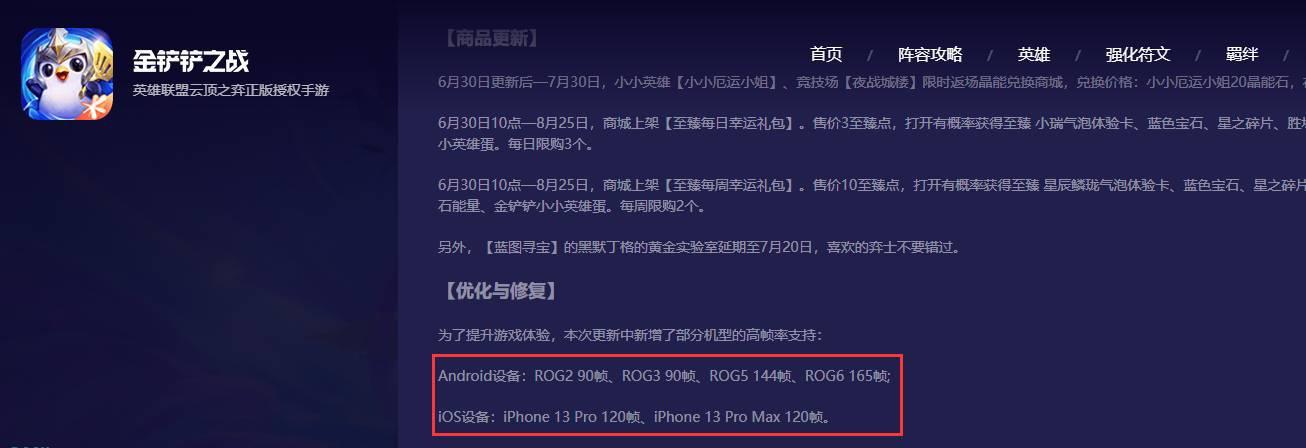 在6月30日开展的升级更新中提升了游戏配置,新增加了一部分能看画质清晰的型号,基本上全是现阶段市面上最大端或是次高端品牌的配备。Android设备:ROG2 90帧,ROG3 90帧,ROG5 144帧,ROG6 165帧;IOS设备:iPhone 13 Pro 120帧,iPhone 13 Pro Max 120帧。