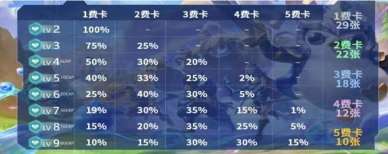 首先,金铲铲之战中卡池数量是91张;而其中一费(一金币)卡一共有29张;二费(二金币)卡一共有22张;三费(三金币)卡一共有18张;四费(四金币)卡一共有12张;五费(五金币)卡一共有10张;其中我们在一局游戏中,是共用这一个卡池里面的卡牌。