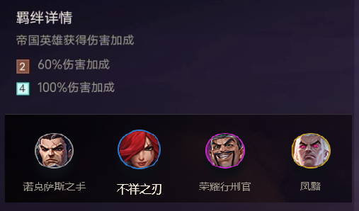 ①羁绊效果是直接增加帝国棋子伤害效果,伤害效果不仅能增加普攻伤害还能增加技能伤害。如诺克萨斯之手2星技能伤害为200,在4帝国羁绊的加持下技能就能造成400伤害。