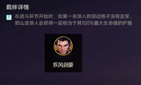①效果是如果对局开始的时候疾风剑豪附近无其他友军,就能增加自身100%血量的护盾。简单理解就是变相增加血量。